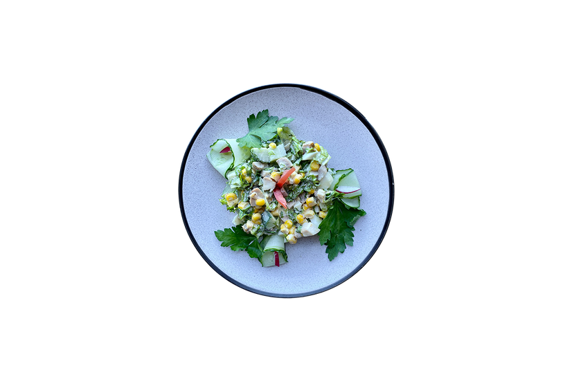 Огірки свіжі, курка відварена, кукурудза, твердий сир, яйце, майонез.