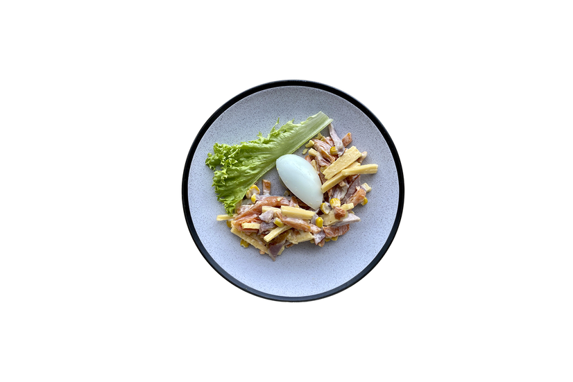 Шинка копчена, морква відварна, яйце відварне, сир твердий, кукурудза, майонез.