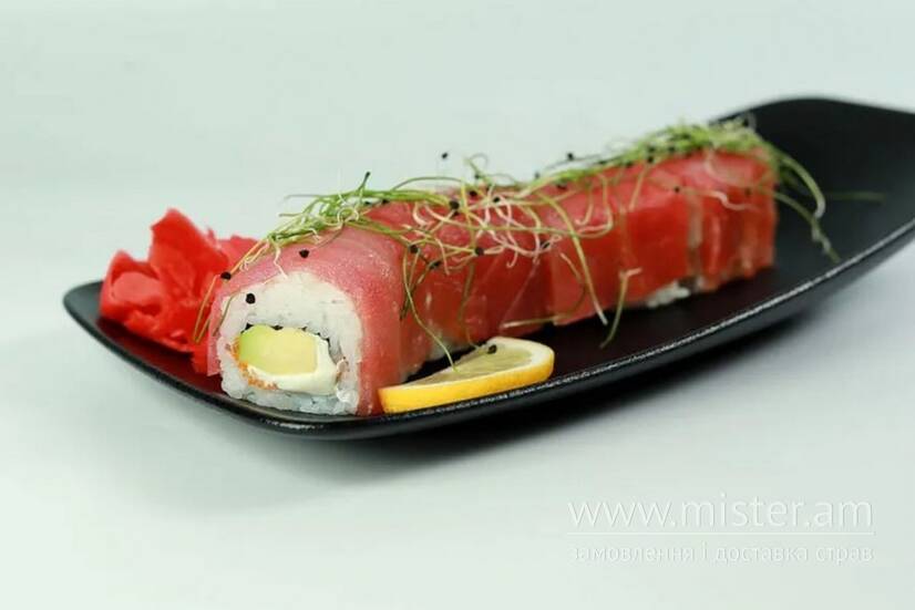 Рис, сир для суші, ікра корюшки, авокадо, огірок, лосось обпалений, соус унагі, лимон.