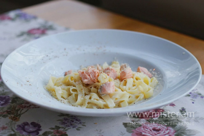 Пенне, філе індички, черрі, шпинат, білий соус, пармезан.