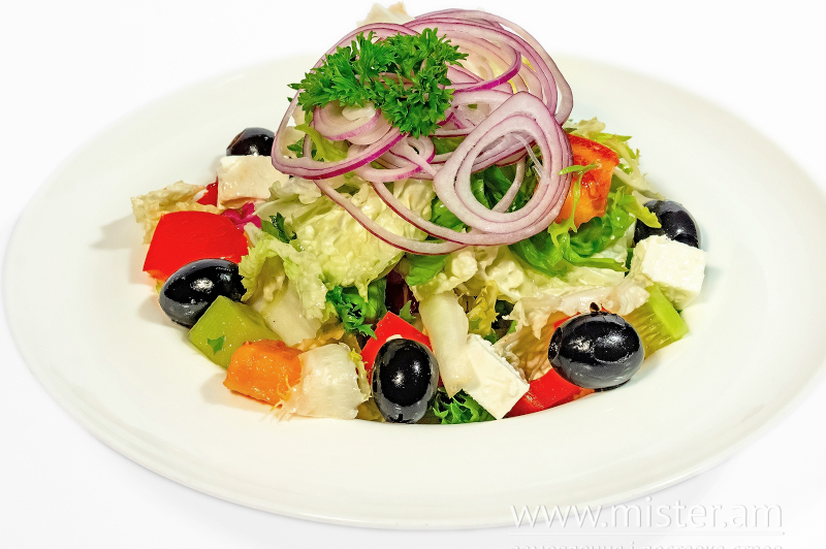 Огірок, помідор, перець болгарський, сир фета, маслини, кримська цибуля, олія, лимон, орегано.