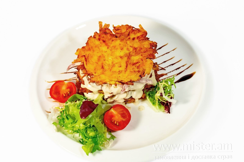 Картопля, морква, цибуля, баварські ковбаски, вершковий соус.