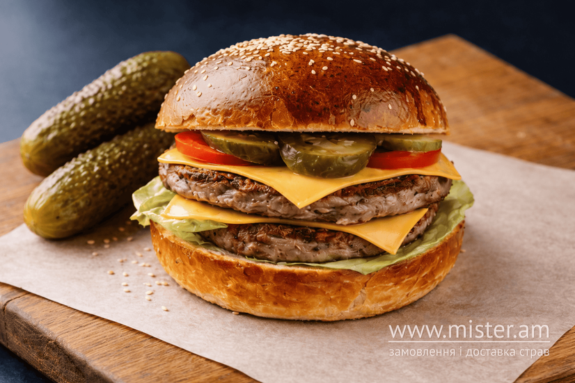 Бургер, салат, картопля фрі, кетчуп.