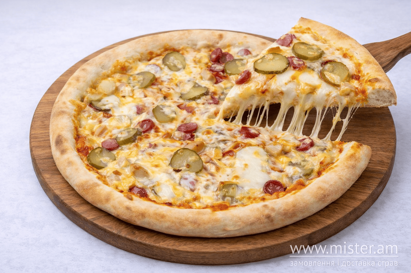 Соус томатний, куряче філе, пепероні, шинка, салямі, квашений огірок, мисливські ковбаски, сир моцарела.