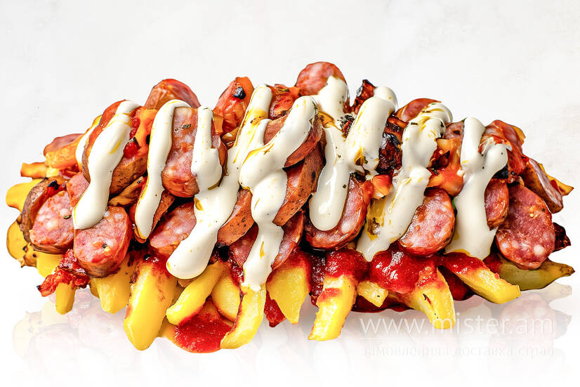 Картопля печена, баварські ковбаски, соус BBQ, соус Цезар, часникова олія