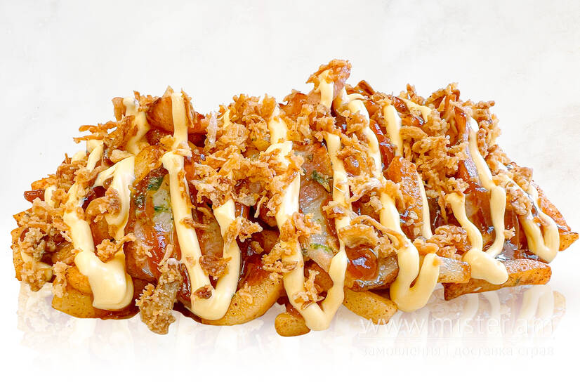 Картопля печена, бекон, цибуля crispy, соус BBQ, соус сирний, часникова олія