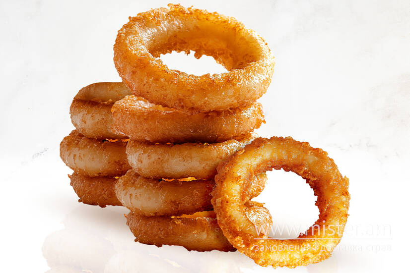 Цибулеві кільця в хрусткому паніруванні, обсмажені до золотистої скоринки.