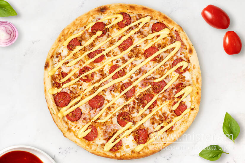 Соус вершковий, сир моцарела, бекон, пепероні, цибуля crispy, соус сирний, часникова олія