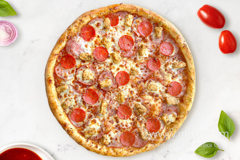 Свинина маринована, салямі, шинка, пепероні, сир моцарела, цибуля маринована, часникова олія, соус BBQ