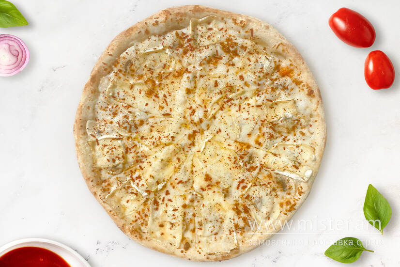 Соус вершковий, гриби, сир моцарела, сир брі, спеція: томат, базилік, часник