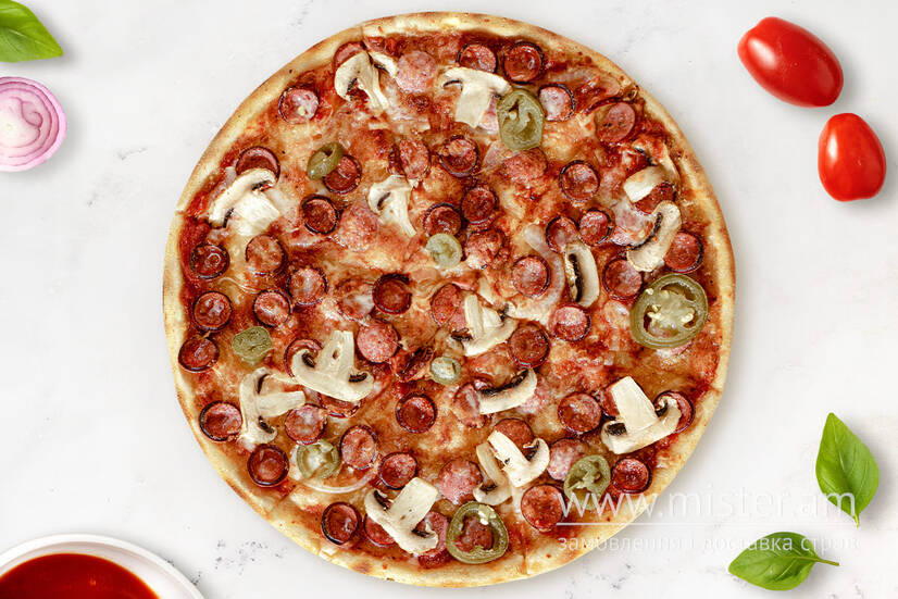 Соус томатний, цибуля маринована, ковбаски баварські, печериці, сир моцарела, перець халапеньйо