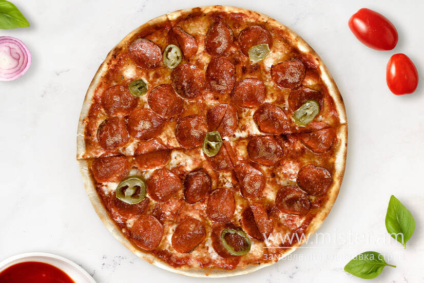 Соус томатний, сир моцарела, пепероні, перець халапеньйо
