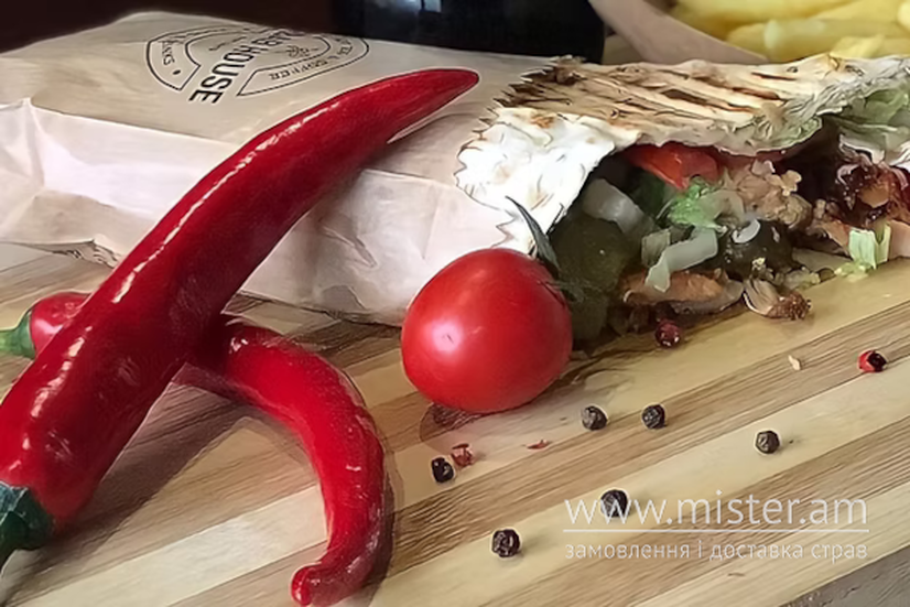 Лаваш, пекінська капуста, томати, огірок, цибуля, м'ясо, гострий соус, соус