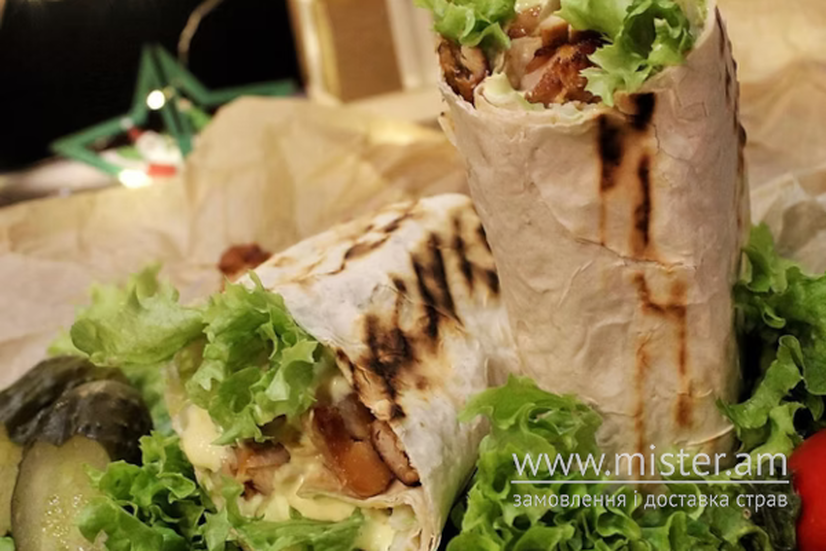 Лаваш, пекінська капуста, томати, огірок, цибуля, м'ясо, сир моцарела, соус