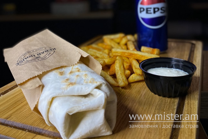 Кебаб L + картопля фрі + напій в асортименті + фірмовий соус