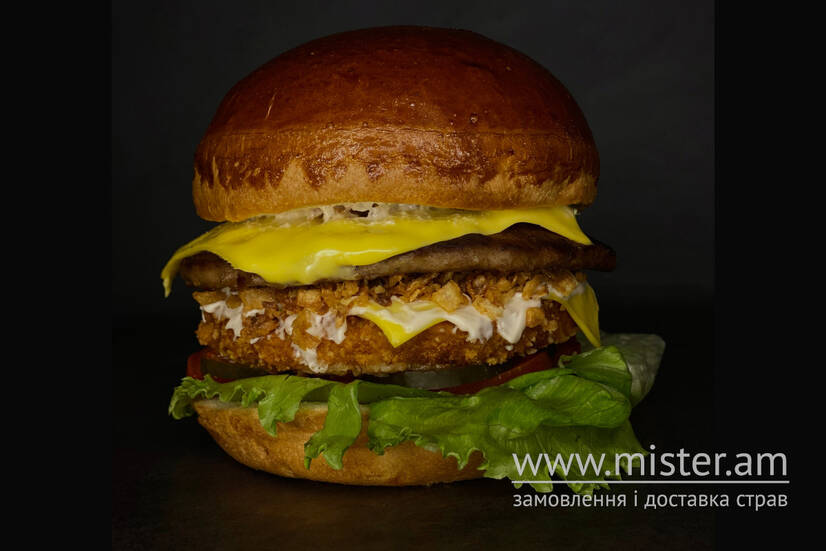 Булка Бріош, котлета яловича 2шт, сир гауда, салат, томати, цибуля кріспі, огірок солений, соус бургер + картопля фрі з фірмовим соусом