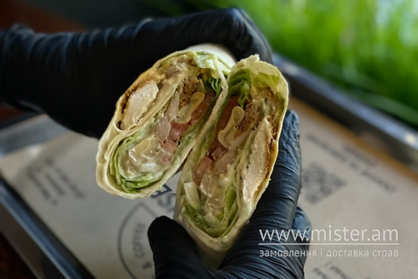Лаваш, айсберг, томати, цибуля, огірок, гриби, м’ясо, сир, соус тартар