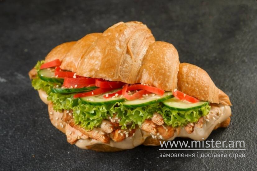 круасан, курка, салат, огірок, імбир маринований, кунжут, соус Теріякі