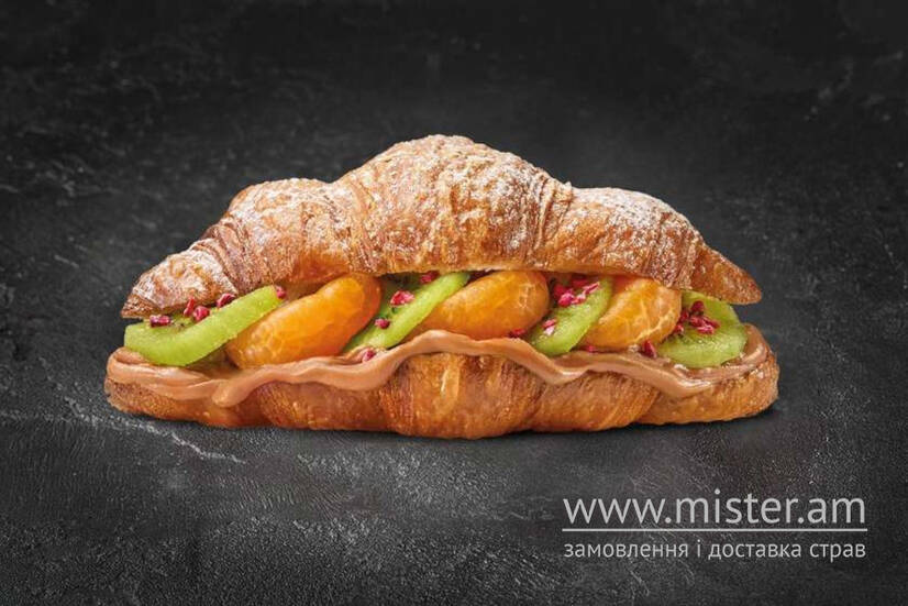 Круасан, ківі, мандарин, сублімована малина, бісквітна паста, цукрова пудра.
