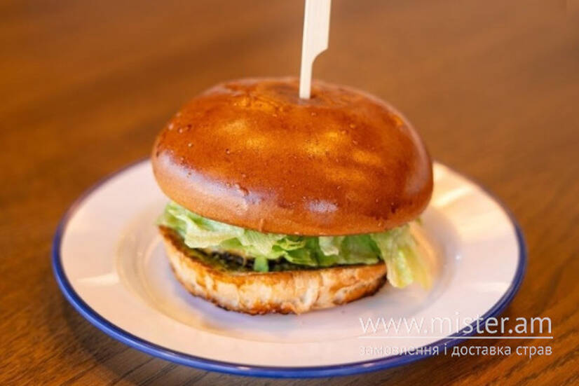 Булочка бріош, котлета яловича, сир чедер, соус песто, салат айсберг, маринований огірок, помідор, айолі з гірчиці.