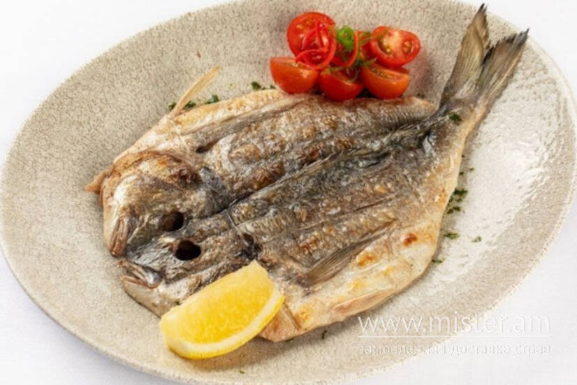 Mare Дорадо на грилі з соусом гремолата томатами чері і лимоном