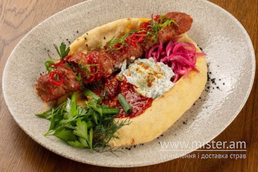 З пітою, маринованою цибулею, соусом аджика, дзадзикі та міксом зелені.