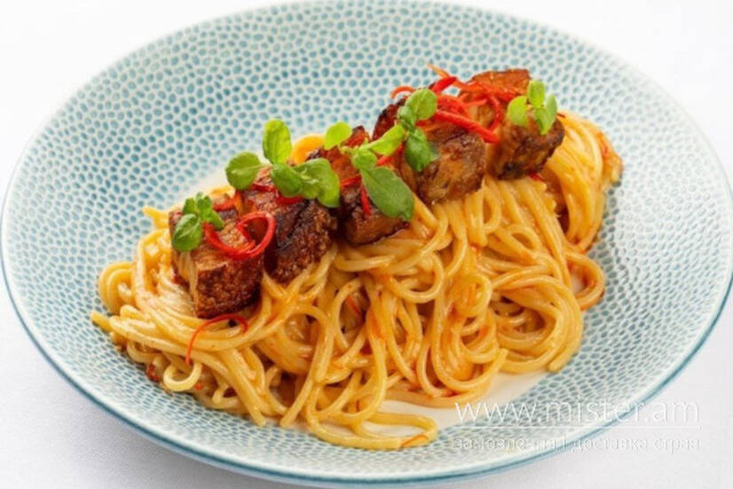 Паста спагеті, соус алео оліо, томлений свинний живіт.