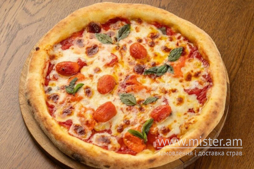 Соус томатний, моцарела, фета, запечені перці, чері, оливкова олія, базилік.