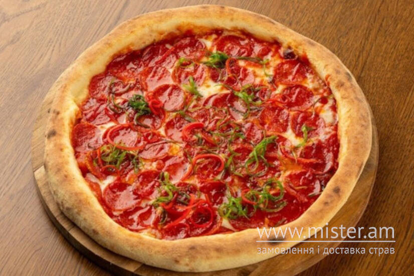 Соус томатний, моцарела, ковбаса пепероні, соус шрірача, цибуля зелена, перець чілі.