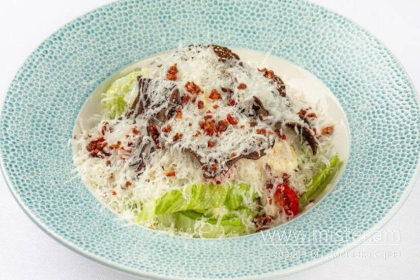 Айсберг, томати чері, соус цезар, королівські креветки, пармезан.
