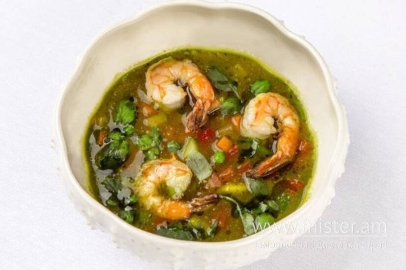 Овочевий бульйон, мікс овочів, соус песто, креветки.