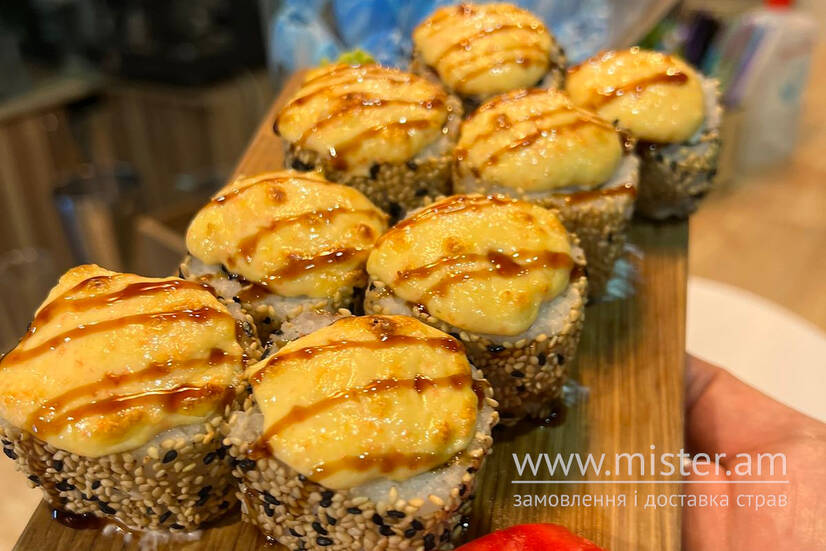 рис, лосось, манго, креветка, філа. сир, тобіко, м’як. чілі, норі