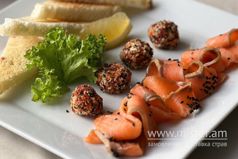 СЛАБОСОЛЕНИЙ ЛОСОСЬ, ПАНІРОВАНІ СИРНІ КУЛЬКИ, ГРІНКИ З БІЛОГО ХЛІБА.