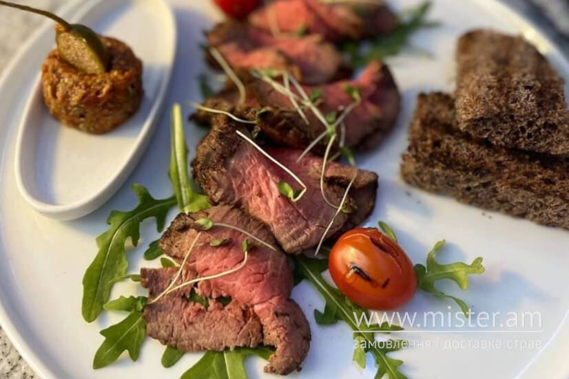 ТЕЛЯЧИЙ РОСТБІФ З ТАРТАРОМ З В`ЯЛЕНИХ ТОМАТІВ