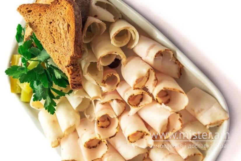 НАРІЗКА З ТРЬОХ ВИДІВ САЛА, КВАШЕНИЙ .ОГІРОК ТА ЧАСНИК