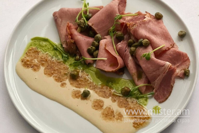 М`ЯСНА ЗАКУСКА З ТЕЛЯЧОГО ЯЗИКА ЗІ СОУСОМ З ТУНЦЯ.
