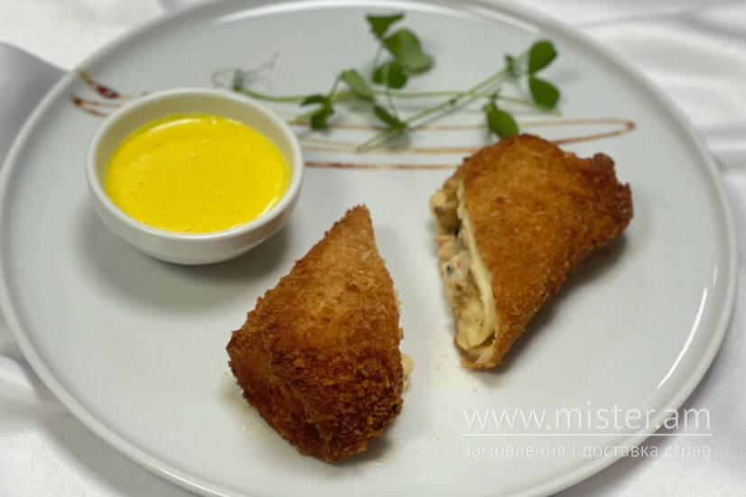 МЛИНЦІ В ПАНІРОВЦІ З КУРКОЮ, ГРИБАМИ ТА СИРОМ, ПОДАЮТЬСЯ ЗІ СОУСОМ ЧЕДЕР.