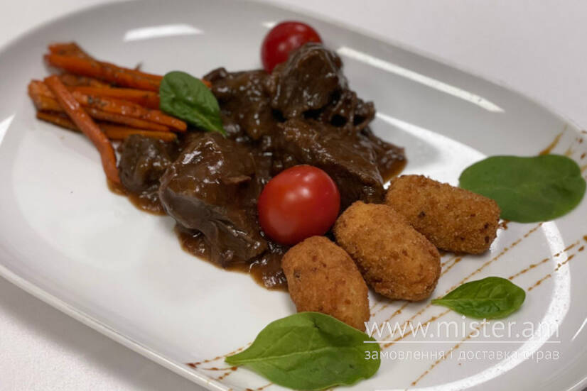 ТЕЛЯЧІ ЩОКИ, СОУС ДЕМІГЛАС, КАРТОПЛЯ , ПОМІДОРИ ЧЕРІ.