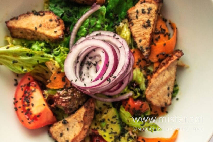 МІКС САЛАТ, ТЕЛЯТИНА, СЕЛЕРА, ОГІРОК, МОРКВА, СВІЖИЙ ПЕРЕЦЬ, ПОМІДОP, ЦИБУЛЯ ЧЕРВОНА, КУНЖУТ, СОУС ДРЕСІНГ.