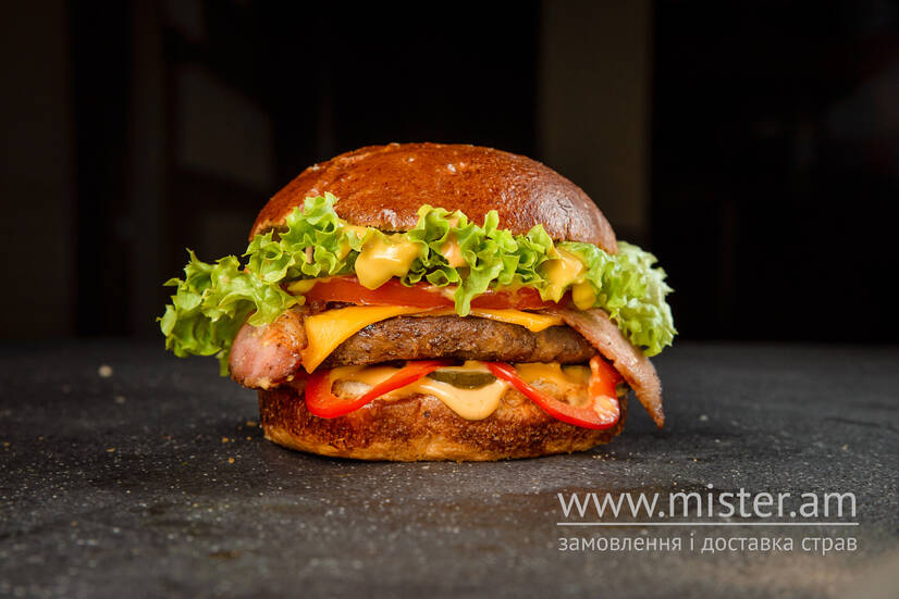 запашна булочка Бріош, соковита яловича котлета, підсмажений бекон, сир вершковий, болгарський перець, томат, маринований огірочок, салат Айсберг, соус для бургерів та гірчиця