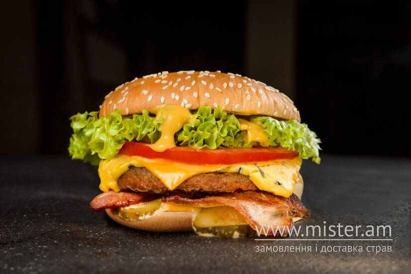 хрумка булочка, соковита яловича котлета, два шматочки підсмаженого бекону, сир "Чеддер", сир з пліснявою, томат, маринований огірочок, салат Айсберг, соус для бургерів
