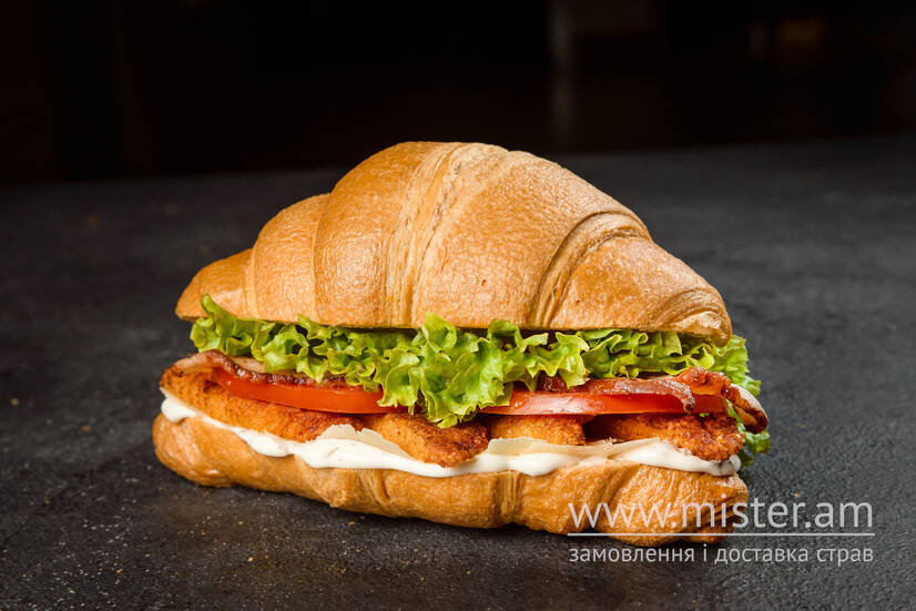 масляний круасан, шматочки соковитого курячого філе в паніруванні, підсмажений бекон, сир “Пармезан”, томат, салат Айсберг, фірмовий соус “Цезар” власного приготування