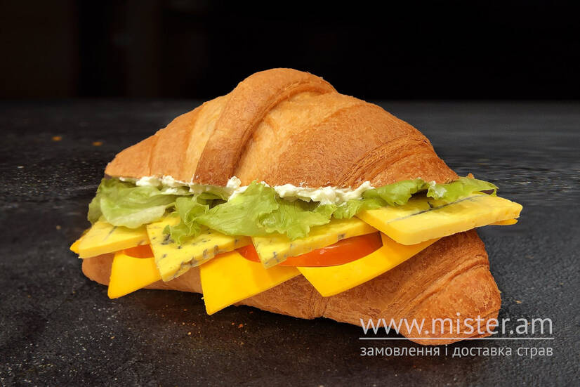 масляний круасан, два шматочки сиру "Чеддер", сир з пліснявою, томати, салат Айсберг