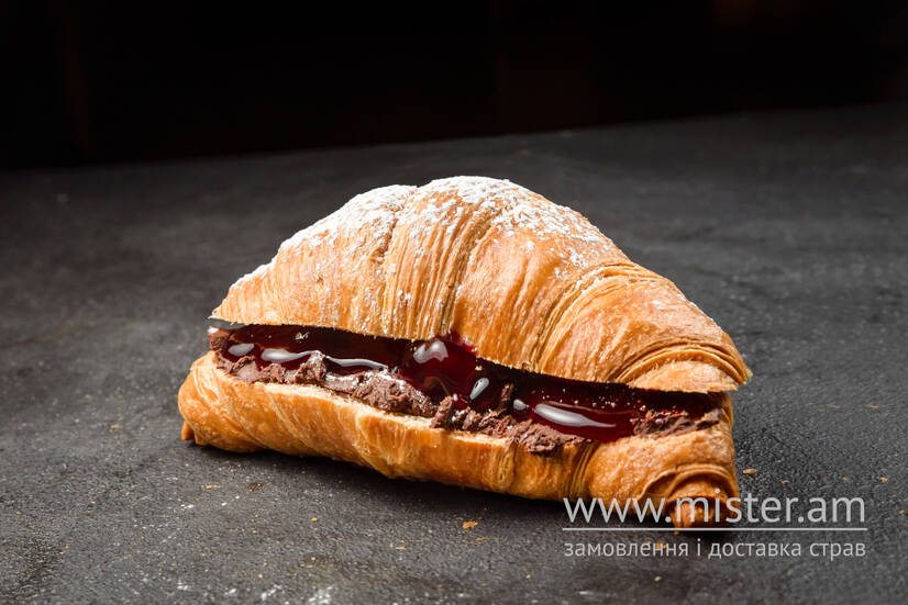 масляний круасан, ароматний конфітюр із шматочками вишні та шоколадно-горіхова паста