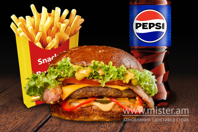 бургер з яловичиною, сиром, томатом та беконом у здобній булочці + хрумка картопля фрі + пепсі пляшка 500мл