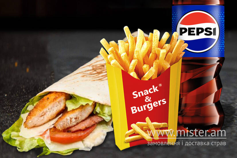 запечена тортилья з курочкою, беконом, томатом, пармезаном та свіжим салатом + хрумка картопля фрі + пепсі пляшка 500мл