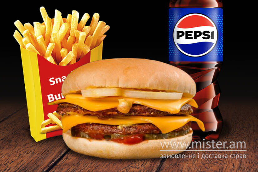 класичний бургер з подвійною котлетою з яловичини, сиром, огірочком та цибулею + хрумка картопля фрі + пепсі пляшка 500мл
