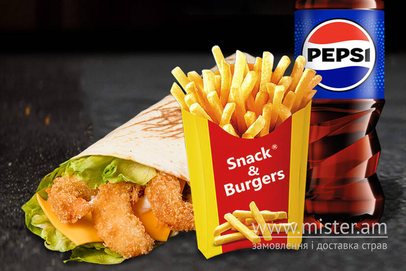 запечена тортилья з соковитими креветками, сиром, свіжим салатом та соусом тартар + хрумка картопля фрі + пепсі пляшка 500мл