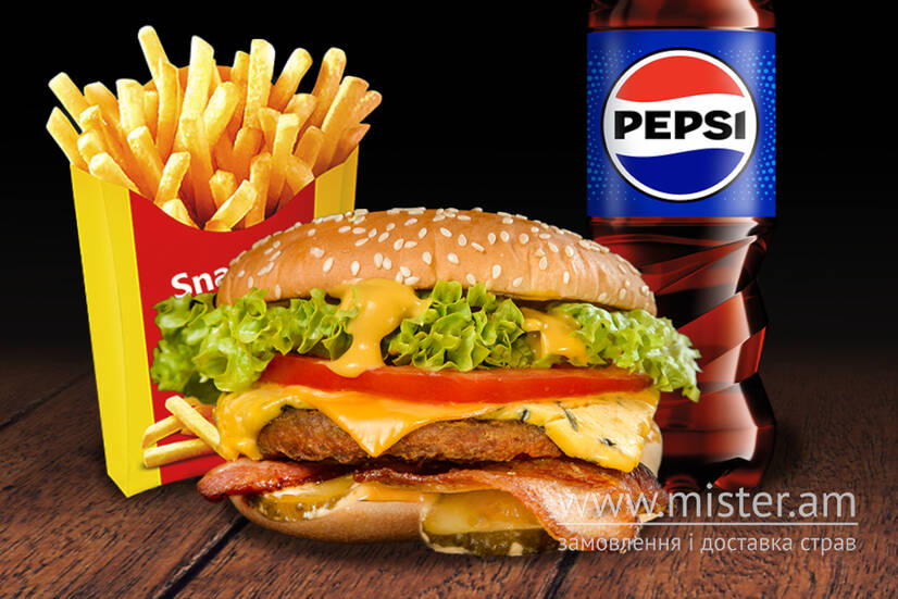бургер з яловичиною, подвійним сиром, беконом та овочами + хрумка картопля фрі та 6 цибулевих кілець + пепсі пляшка 500мл