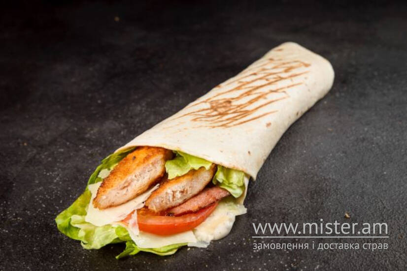 запечена тортиль, соковиті шматочки курячого філе в паніровці, підсмажений бекон, сир “Пармезан”, томат, салат Айсберг, фірмовий соус “Цезар” власного приготування